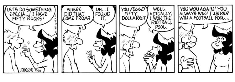 Janis' good fortune with her office's football pool has become something of a running joke in the strip. A "running joke" is one you can use over and over again without getting caught.