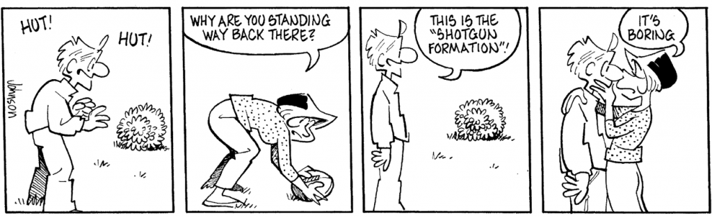 I think this popular classic involving touch football is a good companion piece for the current strip appearing today on GoComics and, of course, in newspapers. Arlo & Janis early on gained a reputation by acknowledging, rather innocently, that a comic strip about marital relations will, occasionally, touch on marital relations. All right, some acknowledgements have been more innocent than others. However, I think this strip would have to be one of the more overtly sexual strips I’ve drawn. I’m not sure I should admit this, but it was inspired by memories of hormonally charged neighborhood football games of my youth.