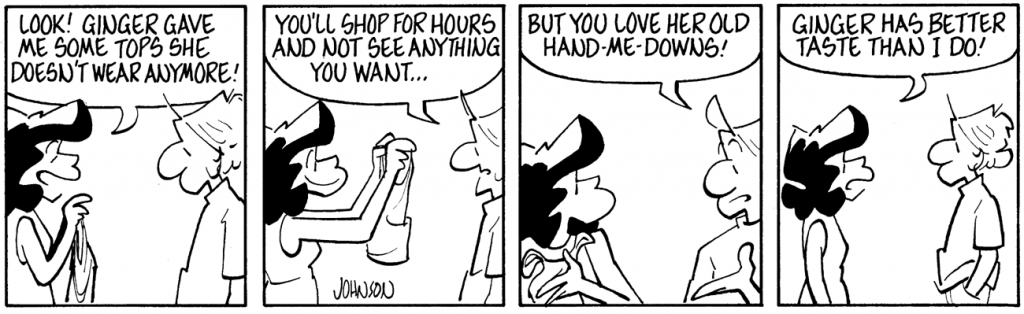 I believe this to be true. Women I know will spend hours swiping through new clothing hanging on a rack in a boutique or a department store and come away empty-handed. However, they’ll become absolutely giddy when a good friend bequeaths them a plastic bag stuffed with old tops. There’s just something about “pre-approved” apparel. Men do not do this so much. Personally, most of my clothing is in one of three states: 1) everyday clothing, well-worn and comfortable, 2) work clothing, truly well-worn and comfortable duds that I am discouraged from wearing in public, sort of wearable rags, 3) true rags, old clothing torn into useful strips (no longer actually worn). And no guy is about to give away a bag of good rags, not even to his best buddy.