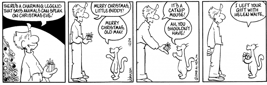 I’ve had a lot of fun over the years with the old European legend that animals are given the ability to speak in human voices on Christmas Eve. It’s a treat after working with a cat who says only “meow” the other 364 days of the year. I hope you will notice, I did it again this year. However, when this comic strip ran in 2008, I received a very angry letter from a distraught woman who said her mother’s maiden name had been “Helen Waite,” and I had ruined her Christmas by abusing her mother’s name and memory in such a tasteless and vile manner. Now, I can’t take credit for the joke; I think Pliny the Elder perhaps could. I remember getting a birthday card from a girlfriend in high school which said, “I gave your gift to Helen Waite, so… etc.” I think the poor woman had heard the old canard so many times that she just snapped when she saw it again the funny papers. I hope she doesn’t see this.