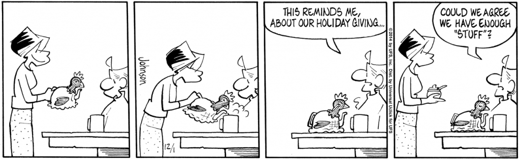 These are the days of hope. We’re passing through that annual period when I am determined to buy everyone on my Christmas list the perfect gift and in timely fashion. I mean, I’ve still got ten days! See the panel below? It’s a link to the Bonus Cartoon. Yes, I’m working on ways to institutionalize the “Bonus Cartoon.” This appears clunky, I know, and it won’t look this way when I’m done, but I do intend to provide some kind of daily link that, regardless of what I do on the blog, will take you to an additional classic Arlo & Janis via GoComics. I hope you will enjoy it and not regard it as “too much sugar for a dime,” as my former mother-in-law would say.