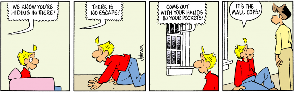 I like “The Mall Cops,” a series that ran ten years ago. I thought it was clever, and if you hang around here much, you know that’s high praise for me coming from myself. Let me set the stage: you will remember that in the winter of 2009, we were at the beginning of The Great Recession. Home foreclosures and store closings were a common thing. Everyone was nervous and uncertain, even those among us lucky enough to not be directly affected. One thing we could do for the nation, we were told, was to “go shopping.” Enter, the mall cops! This is the beginning of a six-day sequence, but I’m not going to post the others here. However, you don’t have to miss a thing: follow this link, and you can binge read all six comic strips right now.