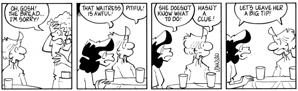 Honk if you’ve ever done this. This classic A&J from 1997 was lifted verbatim from reality, a rarity. I was dining with friends at a restaurant in Bay St. Louis, and we had a terrible waitress. She was sweet as she could be, but it was obvious she’d little experience or training in her work. As she apologized profusely and scurried off toward the kitchen to correct yet another faux pas, we turned to one another and had the exact same exchange as Janis and Arlo above, right down to delivering the “punchline” in unison. “Janis and Arlo.” Sounds odd, doesn’t it?