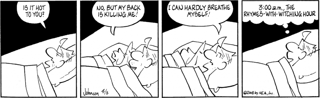 I’m still mining the archives from about 10 years ago, the above from April, 2008. Paraphrasing the fine print in the advertisements for lawyers, “This is not to suggest the services of this comic strip are superior to the services of any other comic strip.” However, innocuous as it is, newspaper readers simply were not used to encountering this sort of thing very often. It simply wasn’t done. Except in Arlo & Janis. (“Honey! Did you see this? He said, ‘Rhymes with witching!’ I can’t believe they printed that!) Honest, I do not believe my contributions have coarsened printed comics strips at all; it’s just that the accepted standards, for so long, were ridiculous.