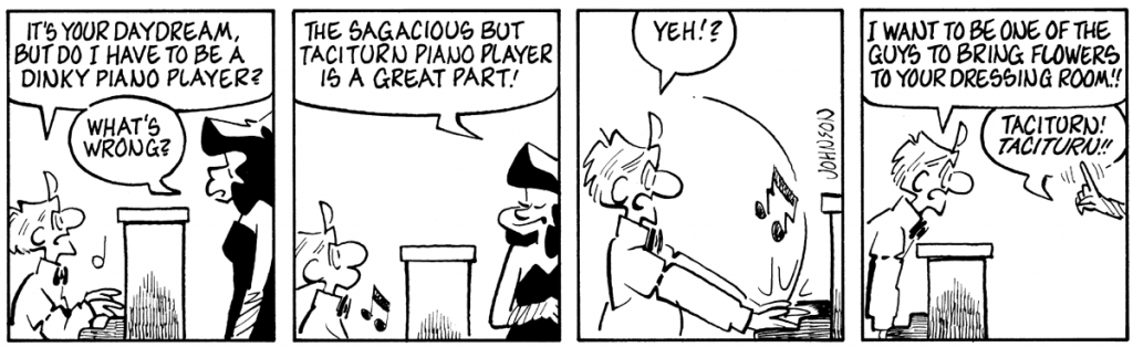 I’m sorry I was absent yesterday; I had to be out of town overnight. Here are the remaining two episodes from the 1998 series that has come to be known as “The Torch Singer.” A majority of us still walking around came of age after 1965, an inexact date chosen for my purposes here. Nothing really changed during the 60’s except perceptions. It became all right to acknowledge that it takes two to tango. I have had a lot of fun over the years, in fantasy strips and in strips about “real” life, suggesting that Janis is as human as the next man. It would not be gentlemanly of me to go into detail, but suffice to say she’s just like you and me. Especially you. And yes, the book is coming soon!