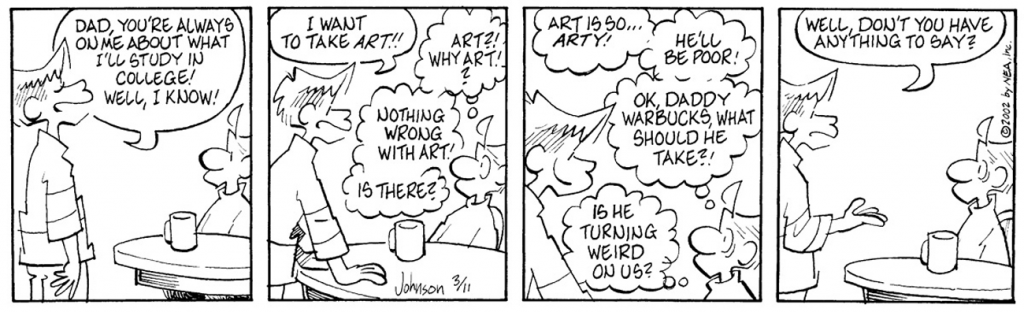 I hope you’re enjoying my little innovation, the addition of the date our classic cartoon originally appeared, which also serves as a link to its GoComics presence. This allows you to follow an entire sequence. The above A&J comic, for example, is the first of a two-week sequence, with a St. Patrick’s Day Sunday cartoon thrown in between for good luck. Also, you can plunder the archives backward and forward, wasting lots of precious time. However, I urge you to use the link responsibly. If you binge-read all the old strips, what will we do here?