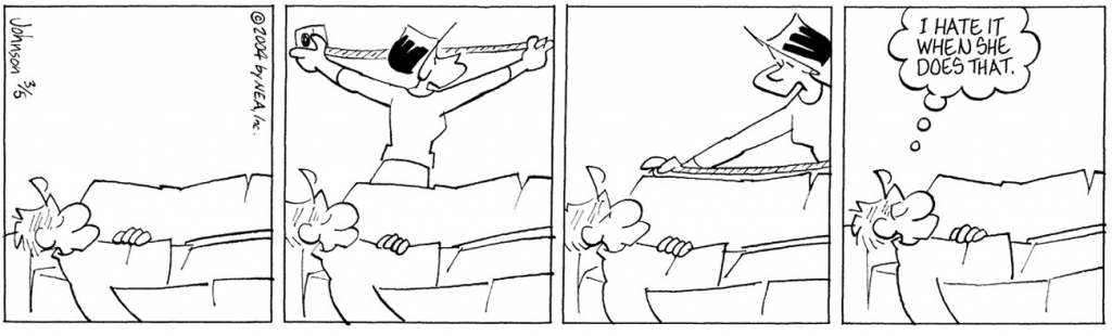 I don’t suppose Arlo and Janis will ever get a new sofa. Theirs is a good cartoon sofa. It’s easy to draw, and its low profile doesn’t obscure any camera angles. I am thinking of recovering it, though. I’m getting a bit tired of that icky salmon/mauve color. Perhaps a nice earth tone, so I won’t have to worry about their clothing clashing with the upholstery. It won’t be a floral print; I can guarantee that. It is based on a sofa I actually owned when I began drawing A&J, so that tells you something about how old it is.