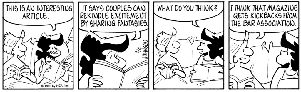 I think sometimes my reputation is exaggerated. I draw a comic strip about marriage and married people. To touch occasionally upon the defining aspect of a conjugal relationship seems only natural to me. Nevertheless, I always have tried to approach this area judiciously, i.e. “sneakily.” I try not to be offensive or to over do it. However, I will say that I’m pretty certain I’m the first cartoonist to depict a husband and wife discussing sexual fantasies in the funny pages.
