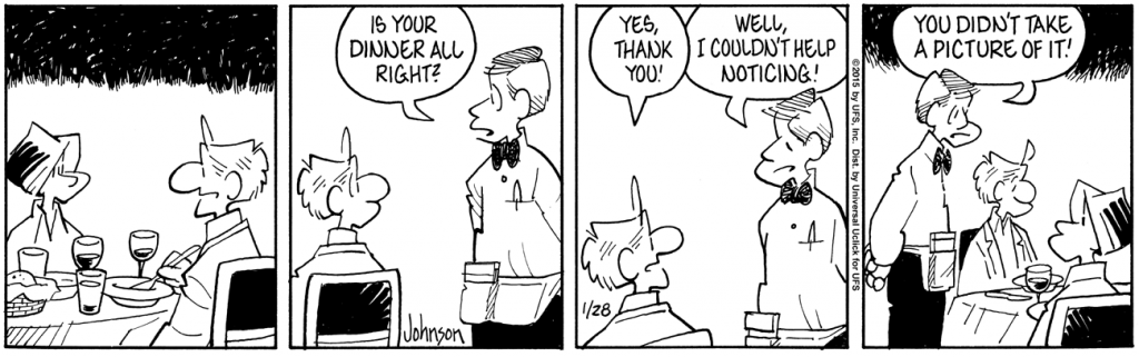 Today’s classic A&J is the first of a little three-part series that can be viewed by clicking on the date below the cartoon. When I was a boy, there actually were a lot of restaurants in the small city where my family lived. They almost all were cafes and diners or steak-and-potatoes joints. Salad invariably was iceberg lettuce. For the gourmands, there might be spaghetti with meatballs. A true gastronomic adventure was to drive south, over the county line to “the backwater” where you could dine on fried catfish at a “fish camp” and—get ready for it—have a beer! Well, the adults could. The fare in these places was simple but good, and most of it went away with the spread of suburbia. Strip malls replaced the downtowns, and fast-food chains replaced the local eateries. However, the local dining scene has made a comeback in this century, much of it cropping up in the once-forlorn downtowns. The experience is likely to be different, and more expensive, than that of my youth, but it is a good thing.