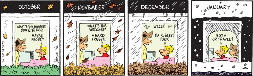 I am a little bit late posting today, but rarely is there a post at all on Monday. Congratulations to the Kansas City Chiefs and the San Francisco 49ers. Both teams won their divisional championship games Sunday and are Super Bowl-bound. Their fans are happy, although for the rest of us the two games left a lot to be desired in the competitiveness department. I’ll have to be for Kansas City. That’s the home of Andrews McMeel Syndication and GoComics. I’ve been there several times, and it’s a nice little city. (Try to go in spring or fall.) Of course, San Francisco is nice, too, and you can go there any time of year.