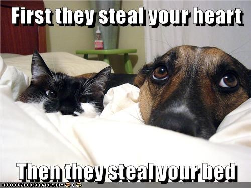 It is amazing how stubborn a ten pound dog can be about moving over. Add four ten pound cats and you lose the bed.